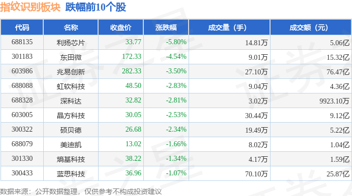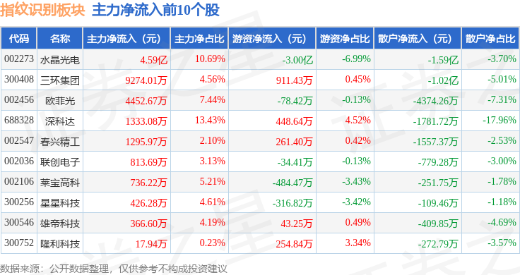 从资金流向上来看,当日指纹识别板块主力资金净流出12.02亿元,游资资金净流入1.8亿元,散户资金净流入10.22亿元。指纹识别板块个股资金流向见下表: