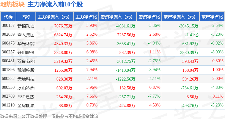 从资金流向上来看,当日地热板块主力资金净流出2.37亿元,游资资金净流入9208.44万元,散户资金净流入1.45亿元。地热板块个股资金流向见下表: