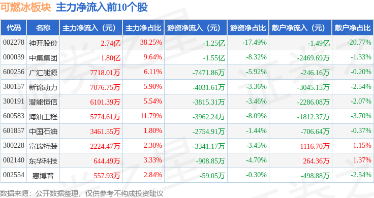 从资金流向上来看,当日可燃冰板块主力资金净流入1.19亿元,游资资金净流出3.99亿元,散户资金净流入2.81亿元。可燃冰板块个股资金流向见下表:
