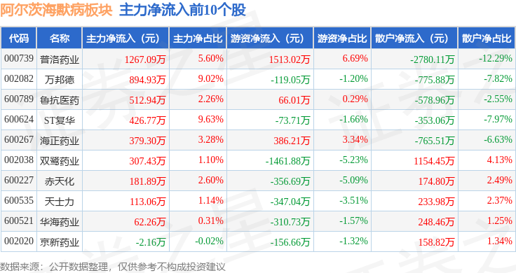 从资金流向上来看,当日阿尔茨海默病板块主力资金净流出6.69亿元,游资资金净流入5.45亿元,散户资金净流入1.24亿元。阿尔茨海默病板块个股资金流向见下表: