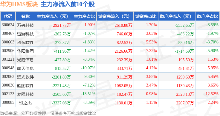 从资金流向上来看,当日华为HMS板块主力资金净流出13.12亿元,游资资金净流入4.99亿元,散户资金净流入8.13亿元。华为HMS板块个股资金流向见下表: