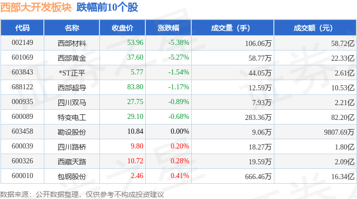 从资金流向上来看,当日西部大开发板块主力资金净流出10.42亿元,游资资金净流出5667.24万元,散户资金净流入10.99亿元。西部大开发板块个股资金流向见下表:
