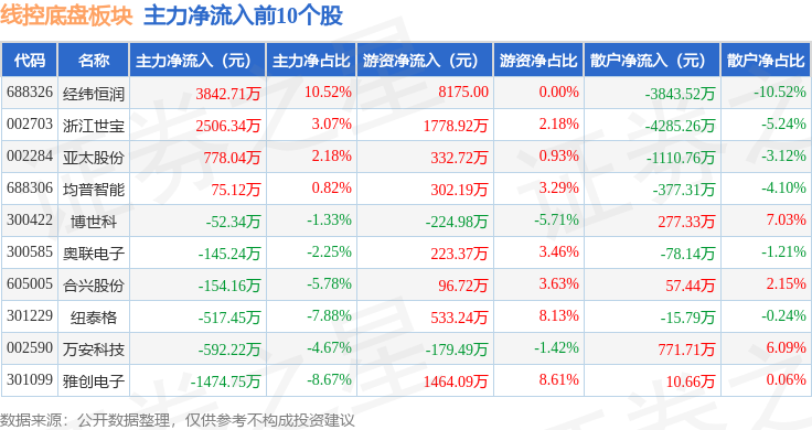 从资金流向上来看,当日线控底盘板块主力资金净流出8192.59万元,游资资金净流入7243.96万元,散户资金净流入948.63万元。线控底盘板块个股资金流向见下表: