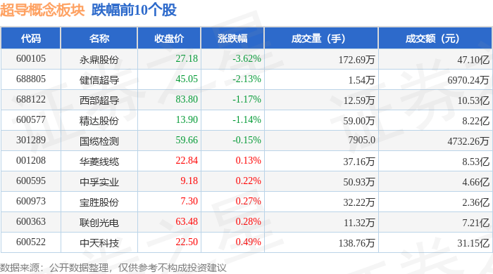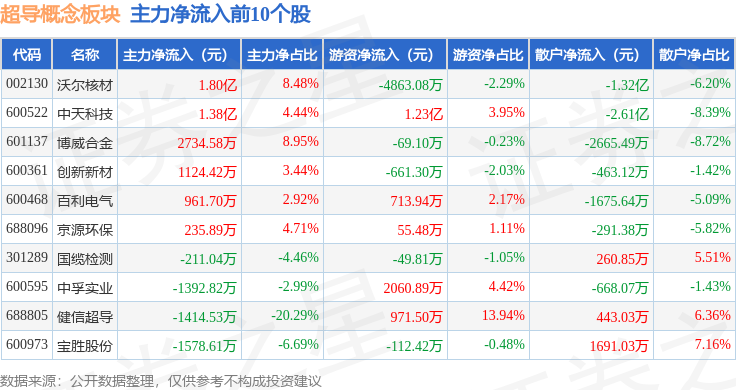 从资金流向上来看,当日超导概念板块主力资金净流出13.78亿元,游资资金净流入6.59亿元,散户资金净流入7.19亿元。超导概念板块个股资金流向见下表: