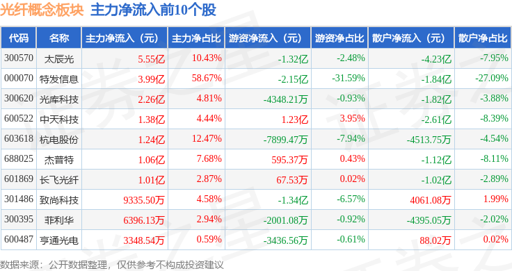 从资金流向上来看,当日光纤概念板块主力资金净流入4.47亿元,游资资金净流出4568.09万元,散户资金净流出4.02亿元。光纤概念板块个股资金流向见下表: