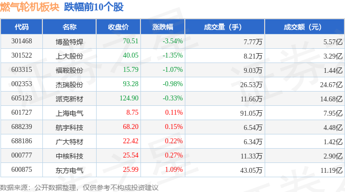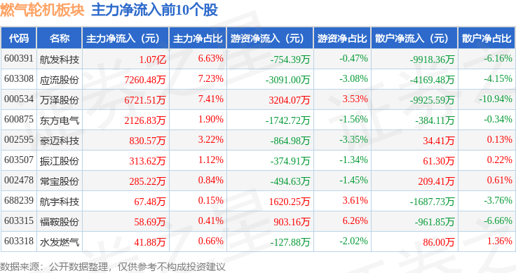 从资金流向上来看,当日燃气轮机板块主力资金净流出3.04亿元,游资资金净流入1.85亿元,散户资金净流入1.18亿元。燃气轮机板块个股资金流向见下表: