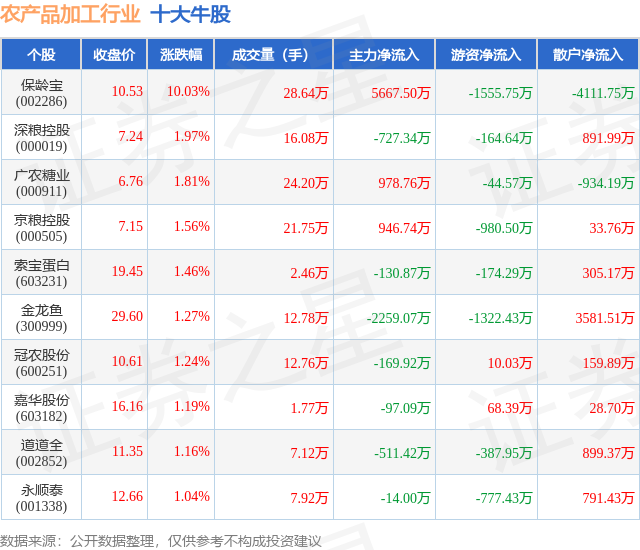 个股表现方面,农产品加工行业当日领涨股为保龄宝(002286),该股当日报收10.53,上涨10.03%,成交量28.64万,主力资金净流入5667.5万元。深粮控股(000019)以上涨1.97%紧随其后,该股当日成交量16.08万,主力资金净流出727.34万元。除此之外,广农糖业(000911)、京粮控股(000505)、索宝蛋白(603231)均进入当日牛股之列。具体个股列表见下表: