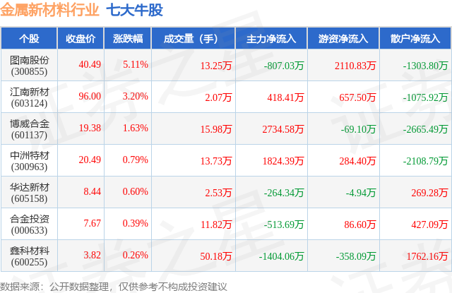 个股表现方面,金属新材料行业当日领涨股为图南股份(300855),该股当日报收40.49,上涨5.11%,成交量13.25万,主力资金净流出807.03万元。江南新材(603124)以上涨3.2%紧随其后,该股当日成交量2.07万,主力资金净流入418.41万元。除此之外,博威合金(601137)、中洲特材(300963)、华达新材(605158)均进入当日牛股之列。具体个股列表见下表:
