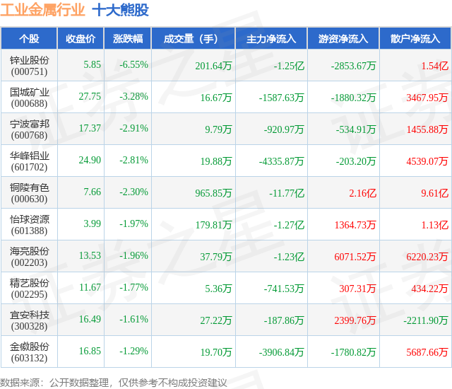 个股表现方面,工业金属行业当日领跌股为锌业股份(000751),该股当日报收5.85,下跌6.55%,成交量201.64万,主力资金净流出1.25亿元。国城矿业(000688)以下跌3.28%紧随其后,该股当日成交量16.67万,主力资金净流出1587.63万元。除此之外,宁波富邦(600768)、华峰铝业(601702)、铜陵有色(000630)均进入当日熊股之列。具体个股列表见下表: