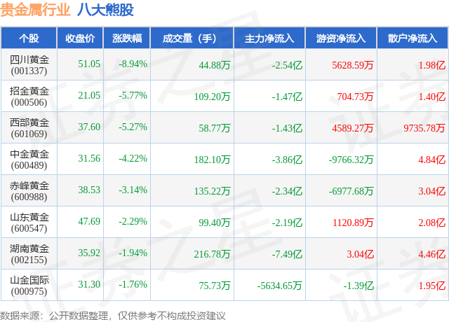 个股表现方面,贵金属行业当日领跌股为四川黄金(001337),该股当日报收51.05,下跌8.94%,成交量44.88万,主力资金净流出2.54亿元。招金黄金(000506)以下跌5.77%紧随其后,该股当日成交量109.2万,主力资金净流出1.47亿元。除此之外,西部黄金(601069)、中金黄金(600489)、赤峰黄金(600988)均进入当日熊股之列。具体个股列表见下表: