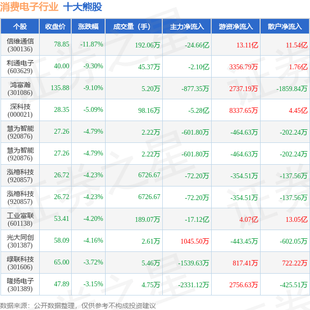 个股表现方面,消费电子行业当日领跌股为信维通信(300136),该股当日报收78.85,下跌11.87%,成交量192.06万,主力资金净流出24.66亿元。利通电子(603629)以下跌9.3%紧随其后,该股当日成交量45.37万,主力资金净流出2.1亿元。除此之外,鸿富瀚(301086)、深科技(000021)、慧为智能(920876)均进入当日熊股之列。具体个股列表见下表: