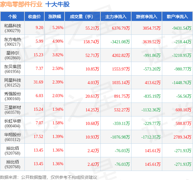 个股表现方面,家电零部件行业当日领涨股为和晶科技(300279),该股当日报收9.2,上涨5.26%,成交量55.21万,主力资金净流入6376.79万元。东方电热(300217)以上涨4.9%紧随其后,该股当日成交量158.74万,主力资金净流出3421.08万元。除此之外,星帅尔(002860)、东贝集团(601956)、同星科技(301252)均进入当日牛股之列。具体个股列表见下表:
