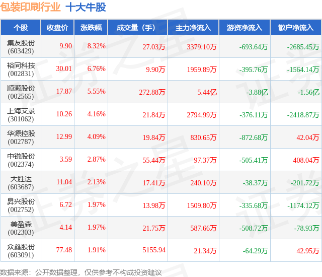 个股表现方面,包装印刷行业当日领涨股为集友股份(603429),该股当日报收9.9,上涨8.32%,成交量27.03万,主力资金净流入3379.1万元。裕同科技(002831)以上涨6.76%紧随其后,该股当日成交量9.9万,主力资金净流入1959.89万元。除此之外,顺灏股份(002565)、上海艾录(301062)、华源控股(002787)均进入当日牛股之列。具体个股列表见下表: