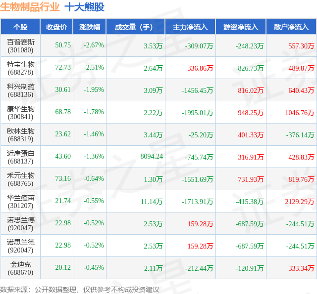 个股表现方面,生物制品行业当日领跌股为百普赛斯(301080),该股当日报收50.75,下跌2.67%,成交量3.53万,主力资金净流出309.07万元。特宝生物(688278)以下跌2.51%紧随其后,该股当日成交量2.64万,主力资金净流入336.86万元。除此之外,科兴制药(688136)、康华生物(300841)、欧林生物(688319)均进入当日熊股之列。具体个股列表见下表: