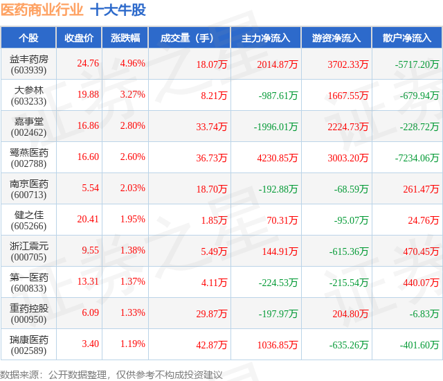 个股表现方面,医药商业行业当日领涨股为益丰药房(603939),该股当日报收24.76,上涨4.96%,成交量18.07万,主力资金净流入2014.87万元。大参林(603233)以上涨3.27%紧随其后,该股当日成交量8.21万,主力资金净流出987.61万元。除此之外,嘉事堂(002462)、鹭燕医药(002788)、南京医药(600713)均进入当日牛股之列。具体个股列表见下表: