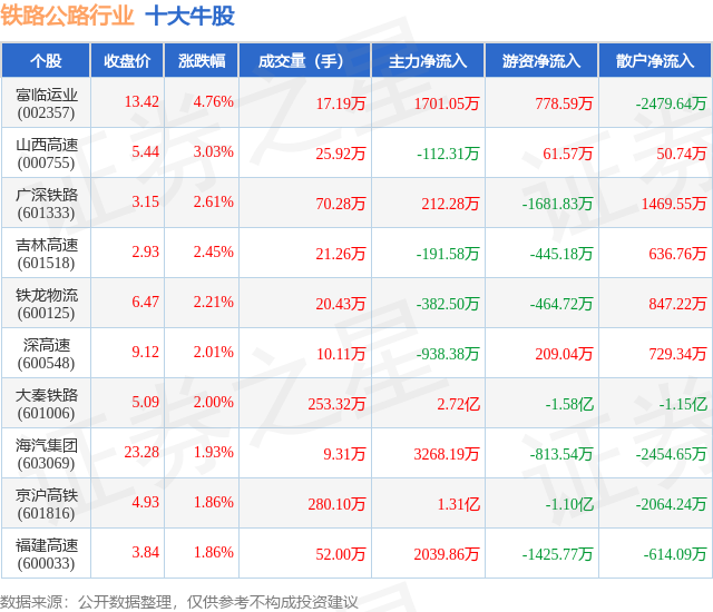 个股表现方面,铁路公路行业当日领涨股为富临运业(002357),该股当日报收13.42,上涨4.76%,成交量17.19万,主力资金净流入1701.05万元。山西高速(000755)以上涨3.03%紧随其后,该股当日成交量25.92万,主力资金净流出112.31万元。除此之外,广深铁路(601333)、吉林高速(601518)、铁龙物流(600125)均进入当日牛股之列。具体个股列表见下表: