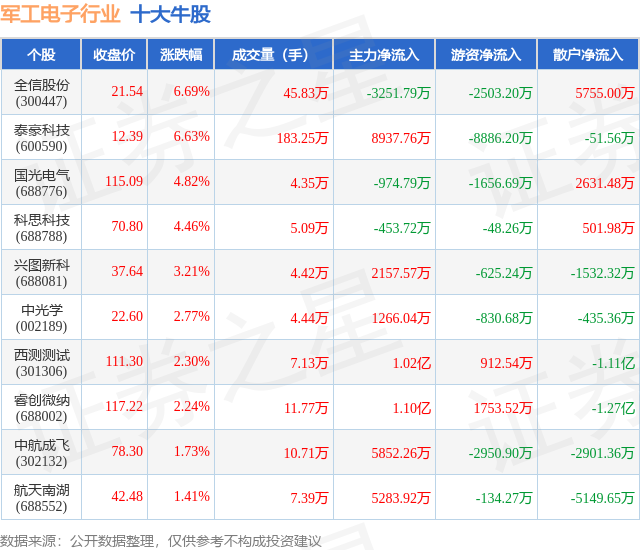 个股表现方面,军工电子行业当日领涨股为全信股份(300447),该股当日报收21.54,上涨6.69%,成交量45.83万,主力资金净流出3251.79万元。泰豪科技(600590)以上涨6.63%紧随其后,该股当日成交量183.25万,主力资金净流入8937.76万元。除此之外,国光电气(688776)、科思科技(688788)、兴图新科(688081)均进入当日牛股之列。具体个股列表见下表: