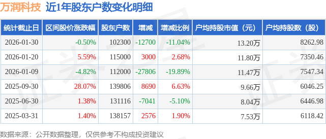 证券之星消息,近日万润科技披露,截至2026年1月30日公司股东户数为10.23万户,较1月20日减少1.27万户,减幅为11.04%。户均持股数量由上期的7350.0股增加至8263.0股,户均持股市值为13.2万元。