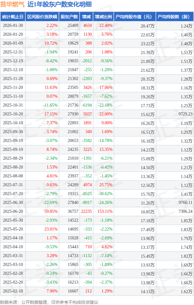 从股价来看,2026年1月20日至2026年1月30日,首华燃气区间涨幅为2.22%,在此期间股东户数增加4650.0户,增幅为22.4%。