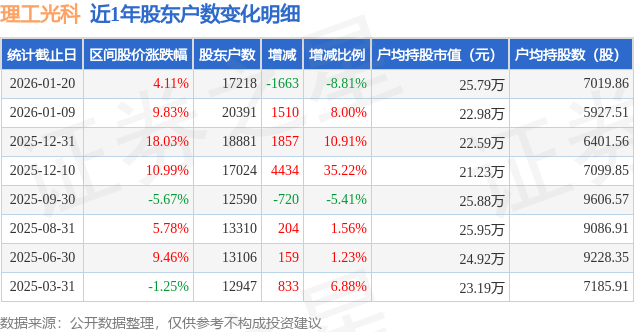 从股价来看,2025年12月31日至2026年1月20日,理工光科区间涨幅为4.11%,在此期间股东户数减少1663.0户,减幅为8.81%。