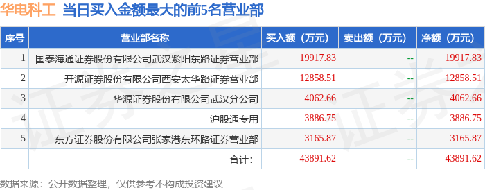 证券之星消息,沪深交易所2026年2月4日公布的交易公开信息显示,华电科工(601226)因有价格涨跌幅限制的日收盘价格涨幅偏离值达到7%的前五只证券登上龙虎榜。此次是近5个交易日内第1次上榜。