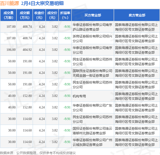 证券之星消息,2月4日百川能源发生大宗交易,交易数据如下: