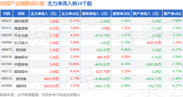 资金流向方面,持续产业(000114)指数成份股当日主力资金净流入合计14.92亿元,游资资金净流出合计6.32亿元,散户资金净流出合计8.6亿元。成份股资金流向详情见下表:
