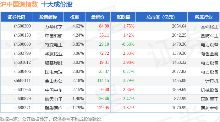 沪中国造(000161)指数十大成份股详情如下: