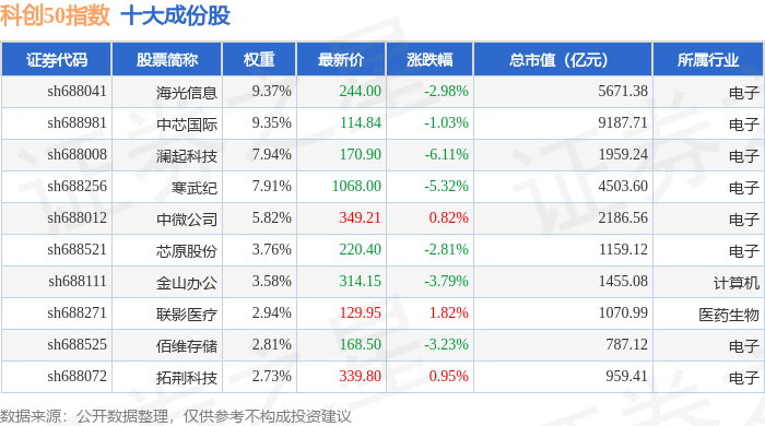 证券之星消息,2月4日,科创50(000688)指数报收于1453.48点,跌1.2%,成交765.93亿元,换手率2.32%。当日该指数成份股中,上涨的有23家,晶科能源以20.0%的涨幅领涨,下跌的有27家,澜起科技以6.11%的跌幅领跌。