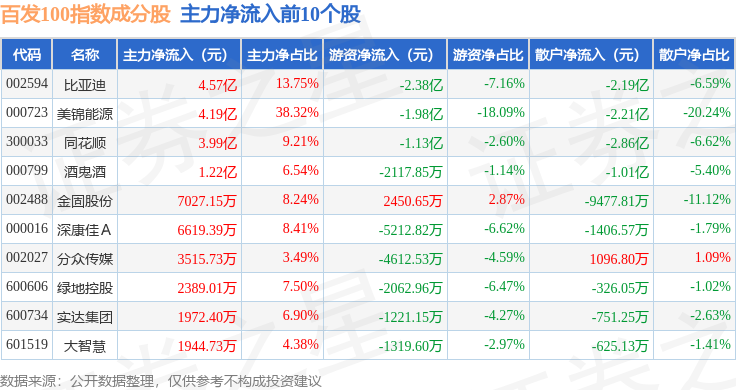 资金流向方面,百发100(000851)指数成份股当日主力资金净流出合计7.25亿元,游资资金净流出合计1.38亿元,散户资金净流入合计8.63亿元。成份股资金流向详情见下表: