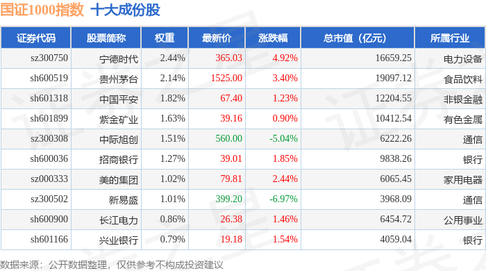 国证1000(399311)指数十大成份股详情如下: