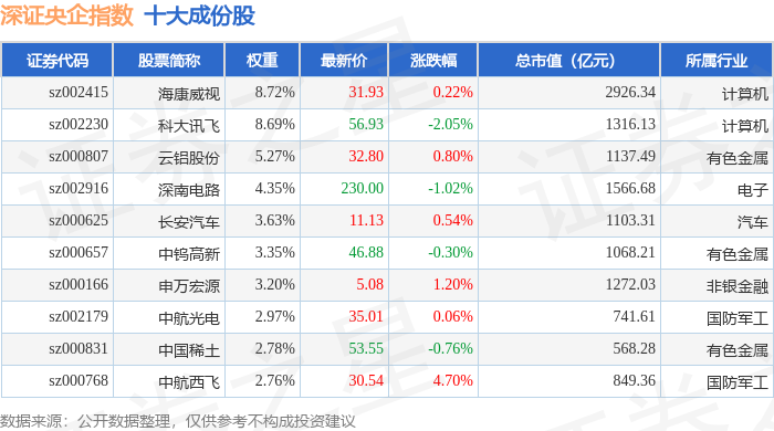 深证央企(399335)指数十大成份股详情如下:
