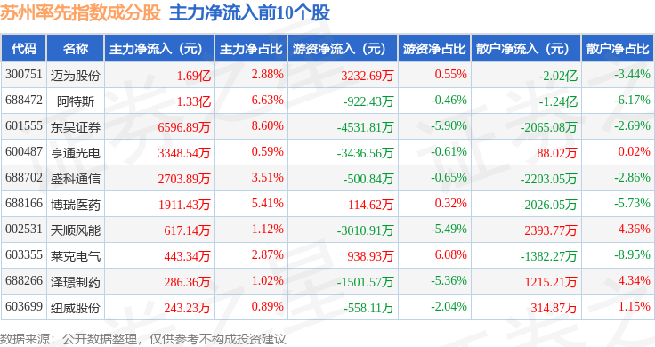 资金流向方面,苏州率先(399410)指数成份股当日主力资金净流出合计17.2亿元,游资资金净流入合计4.79亿元,散户资金净流入合计12.4亿元。成份股资金流向详情见下表: