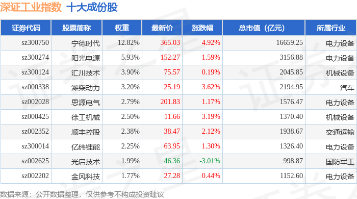深证工业(399615)指数十大成份股详情如下: