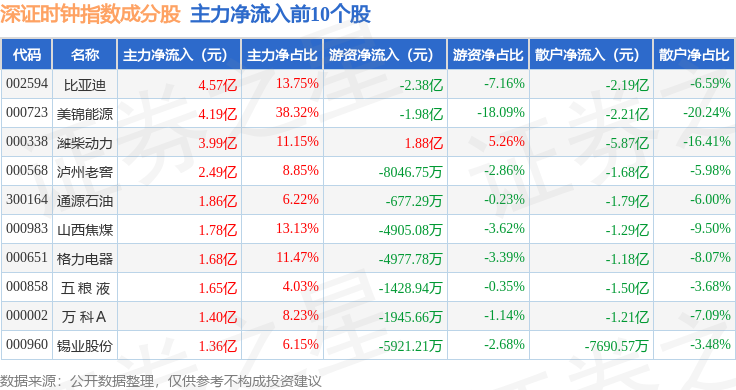 资金流向方面,深证时钟(399644)指数成份股当日主力资金净流出合计10.79亿元,游资资金净流入合计3916.97万元,散户资金净流入合计10.4亿元。成份股资金流向详情见下表: