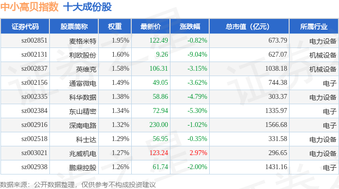 证券之星消息,2月4日,中小高贝(399664)指数报收于1559.78点,跌0.76%,成交1262.5亿元,换手率3.85%。当日该指数成份股中,上涨的有33家,银轮股份以10.01%的涨幅领涨,下跌的有67家,利欧股份以9.04%的跌幅领跌。