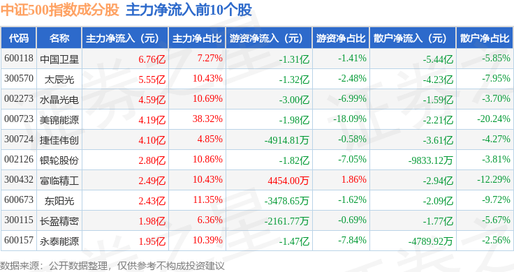 资金流向方面,中证500(399905)指数成份股当日主力资金净流出合计208.04亿元,游资资金净流入合计47.24亿元,散户资金净流入合计160.8亿元。成份股资金流向详情见下表: