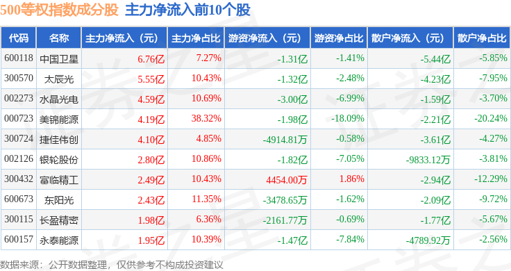 资金流向方面,500等权(399982)指数成份股当日主力资金净流出合计208.04亿元,游资资金净流入合计47.24亿元,散户资金净流入合计160.8亿元。成份股资金流向详情见下表: