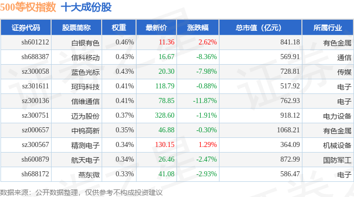 500等权(399982)指数十大成份股详情如下: