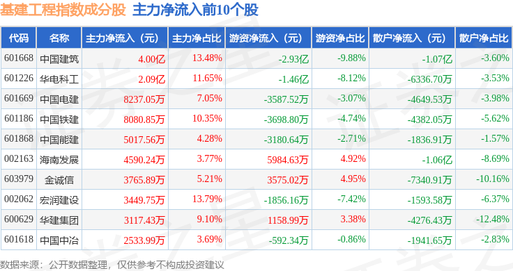 资金流向方面,基建工程(399995)指数成份股当日主力资金净流出合计2713.76万元,游资资金净流出合计3.07亿元,散户资金净流入合计3.34亿元。成份股资金流向详情见下表:
