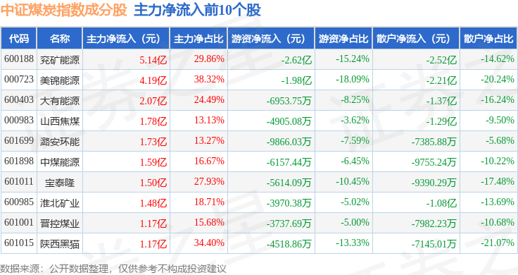 资金流向方面,中证煤炭(399998)指数成份股当日主力资金净流入合计27.39亿元,游资资金净流出合计11.3亿元,散户资金净流出合计16.09亿元。成份股资金流向详情见下表: