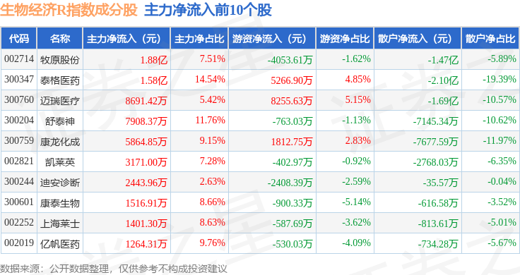 资金流向方面,生物经济R(470038)指数成份股当日主力资金净流出合计3.52亿元,游资资金净流入合计3.64亿元,散户资金净流出合计1173.05万元。成份股资金流向详情见下表: