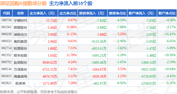 资金流向方面,深证回购R(470063)指数成份股当日主力资金净流入合计30.32亿元,游资资金净流出合计9.39亿元,散户资金净流出合计20.93亿元。成份股资金流向详情见下表:
