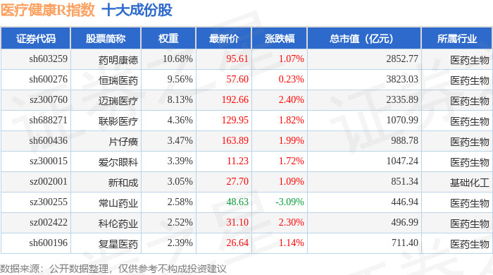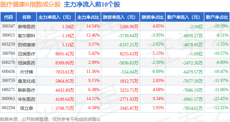 资金流向方面,医疗健康R(480016)指数成份股当日主力资金净流入合计4.38亿元,游资资金净流入合计1.94亿元,散户资金净流出合计6.33亿元。成份股资金流向详情见下表: