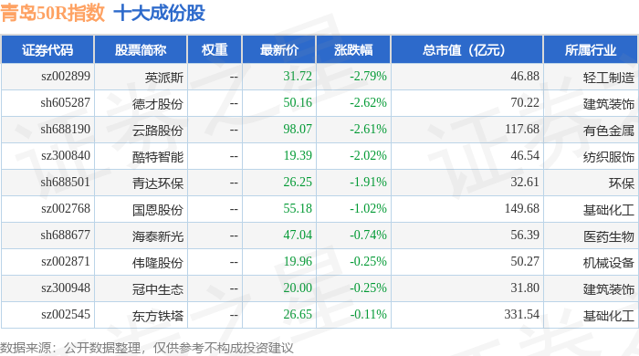 证券之星消息,2月4日,青岛50R(489011)指数报收于2793.72点,涨1.71%,成交119.82亿元,换手率2.3%。当日该指数成份股中,上涨的有30家,森麒麟以4.29%的涨幅领涨,下跌的有11家,英派斯以2.79%的跌幅领跌。