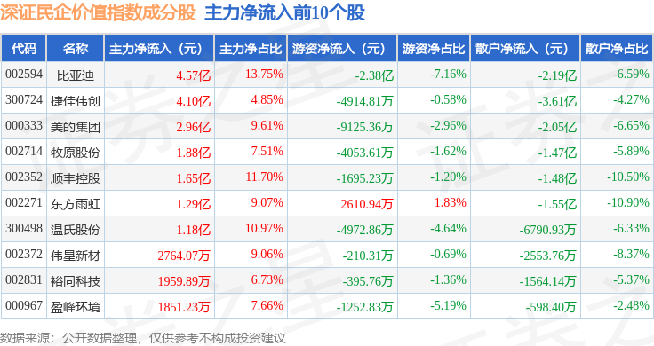 资金流向方面,深证民企价值(970072)指数成份股当日主力资金净流入合计8.29亿元,游资资金净流出合计1.49亿元,散户资金净流出合计6.8亿元。成份股资金流向详情见下表: