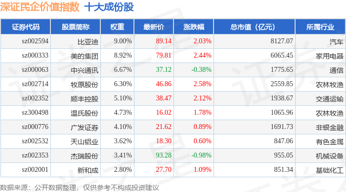 深证民企价值(970072)指数十大成份股详情如下: