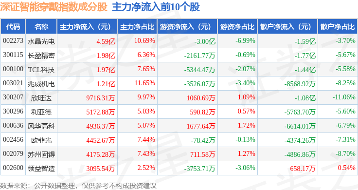 资金流向方面,深证智能穿戴(970074)指数成份股当日主力资金净流出合计52.58亿元,游资资金净流入合计21.62亿元,散户资金净流入合计30.96亿元。成份股资金流向详情见下表: