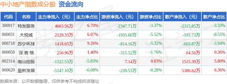 资金流向方面,中小地产(971002)指数成份股当日主力资金净流入合计1792.25万元,游资资金净流出合计5645.38万元,散户资金净流入合计3853.12万元。成份股资金流向详情见下表: