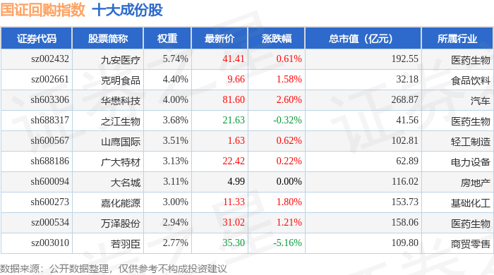 证券之星消息,2月4日,国证回购(980063)指数报收于3651.86点,涨0.89%,成交717.34亿元,换手率1.26%。当日该指数成份股中,上涨的有40家,平煤股份以7.32%的涨幅领涨,下跌的有8家,华联控股以6.12%的跌幅领跌。